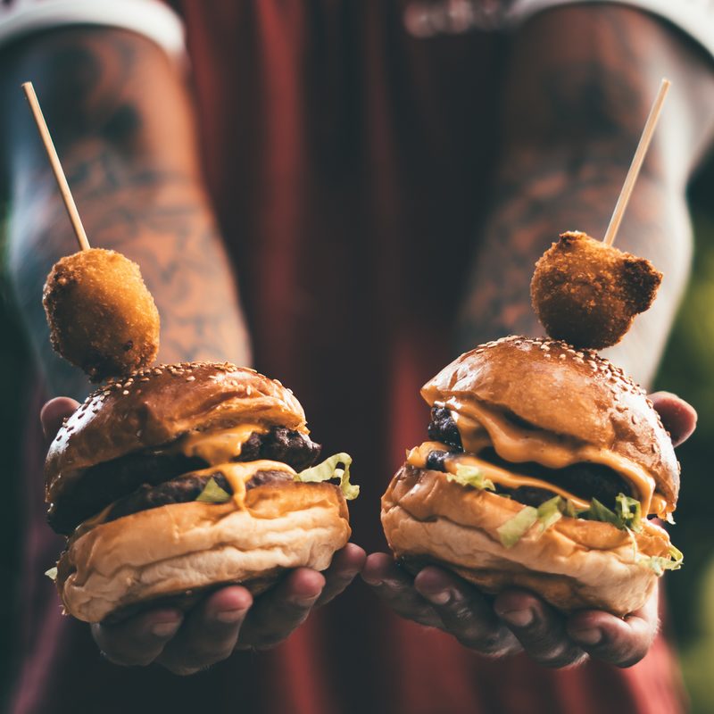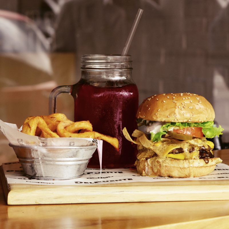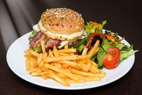 Beef meat, bacon, onion, cheese, tomatoes, bread, bbq + homemade fries, salad & a soft drink (0,33l)