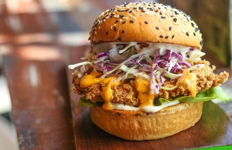Chicken meat, onion, cheese, tomatoes, bread, ketchup